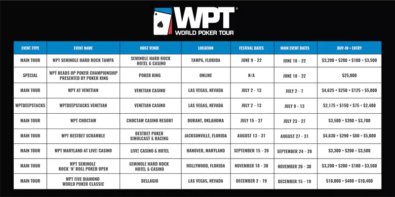 De WPT keert ook terug naar eerdere grote locaties om 2021 af te ronden, waaronder Jacksonville bestbet in augustus, Maryland Live! in september, Seminole Hard Rock Hollywood in november en Bellagio in december.